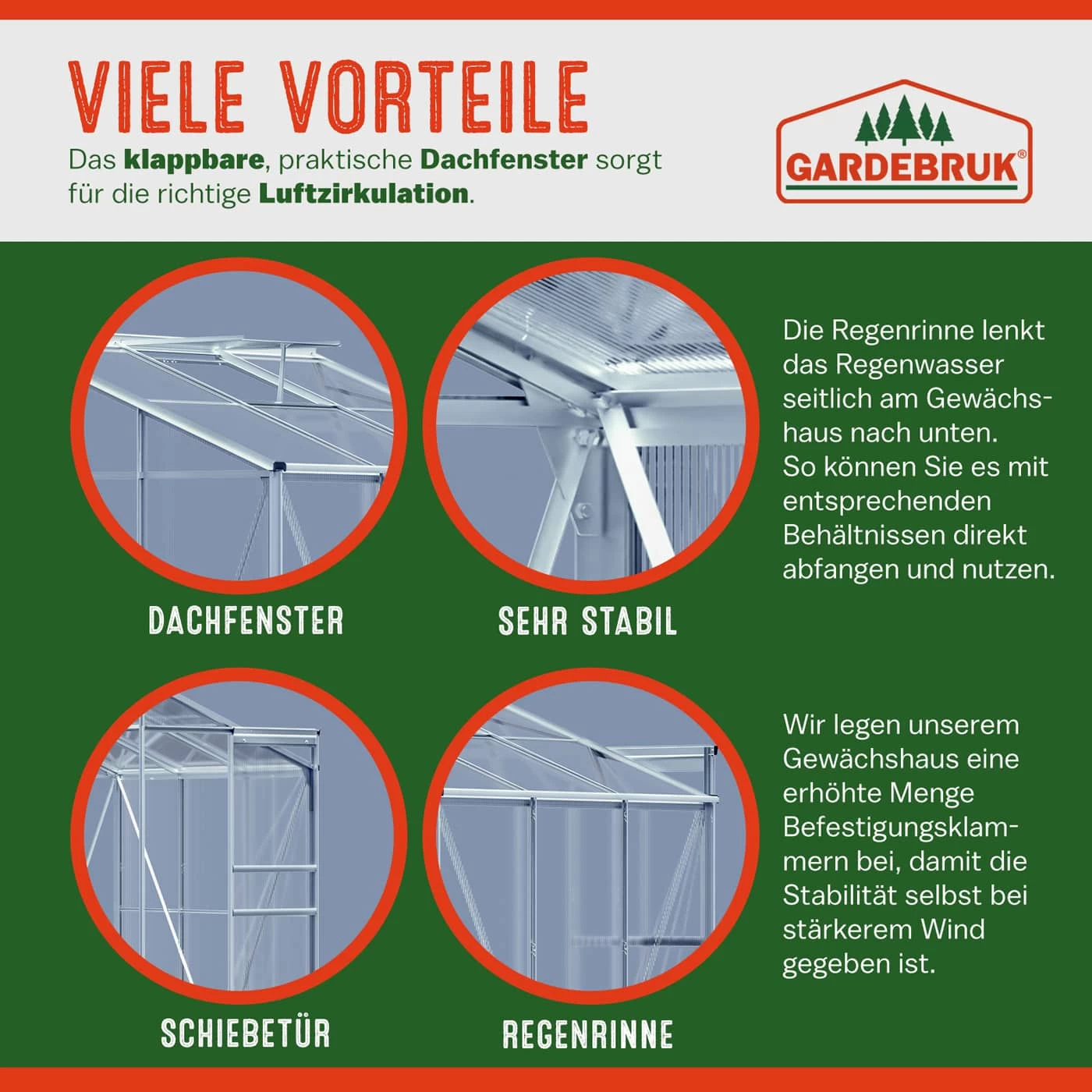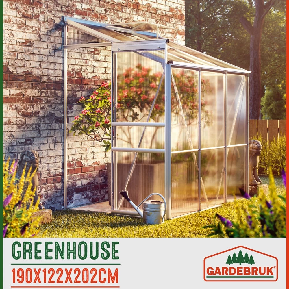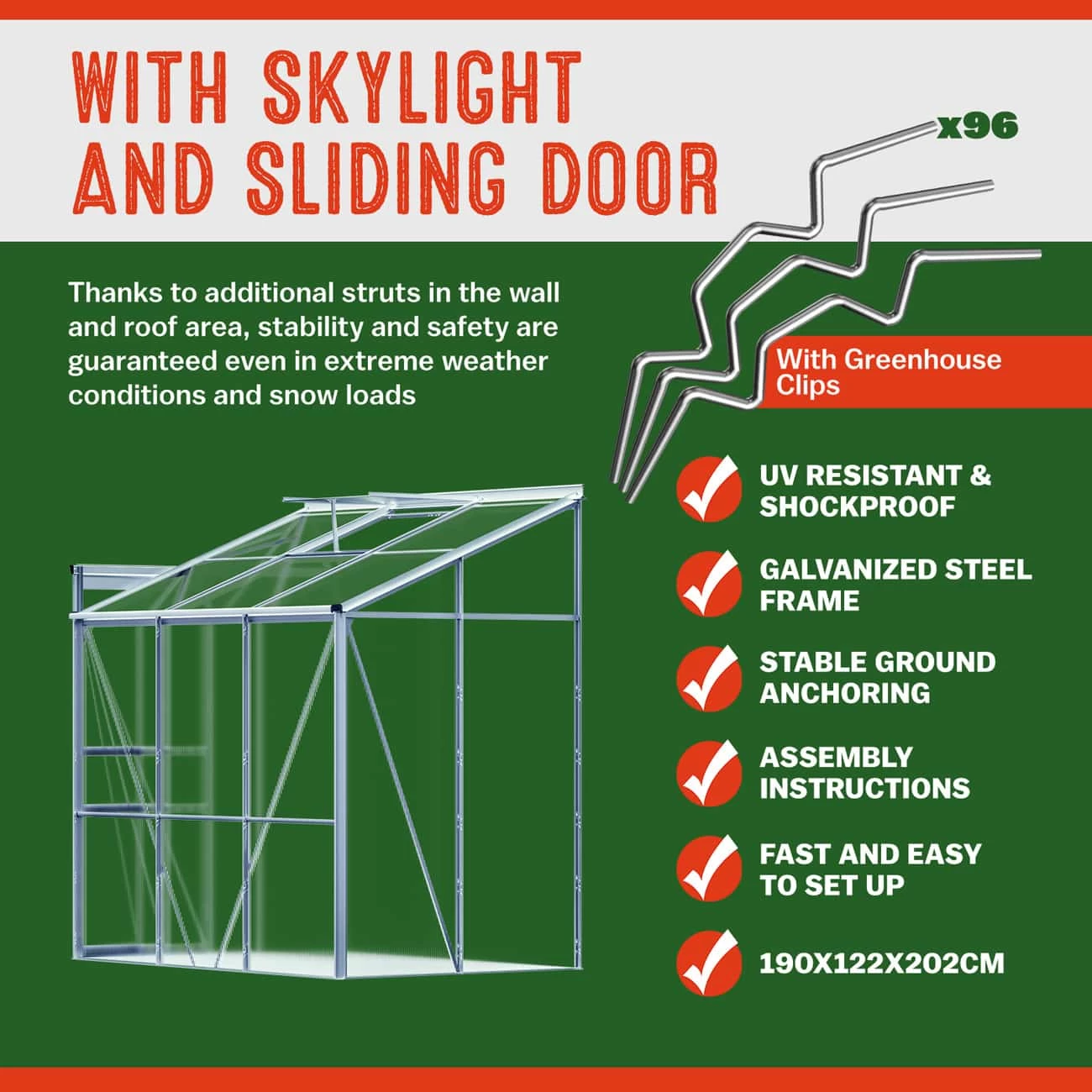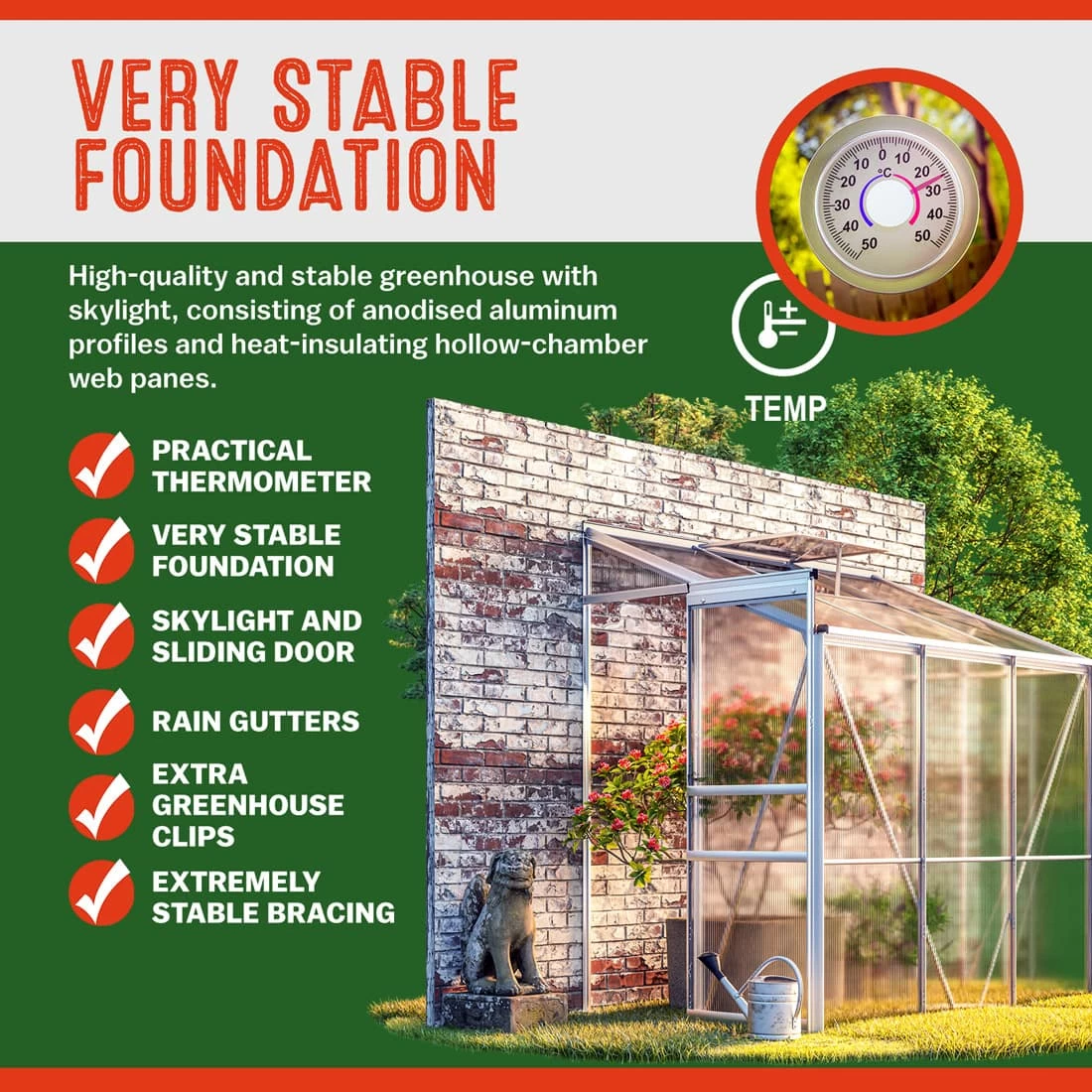 Das Gewächshaus bestehend aus eloxierten Aluminiumprofilen und wärmedämmenden Hohlkammerstegscheiben lässt sich an jeder Wand aufstellen. Das klappbare, praktische Dachfenster, sorgt für die richtige Luftzirkulation.