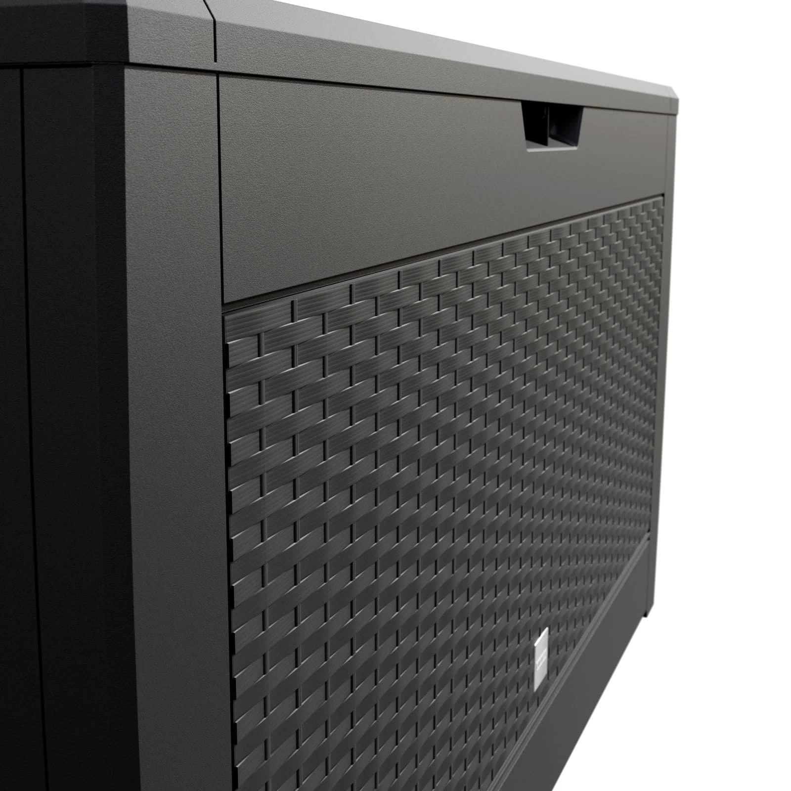 Die wetter- und UV-beständige Auflagenbox mit einem Volumen von 310 Litern bietet ausreichend Platz. Sie besitzt Rollen zum einfachen Bewegen, drei Griffe und ist leicht zu montieren.
