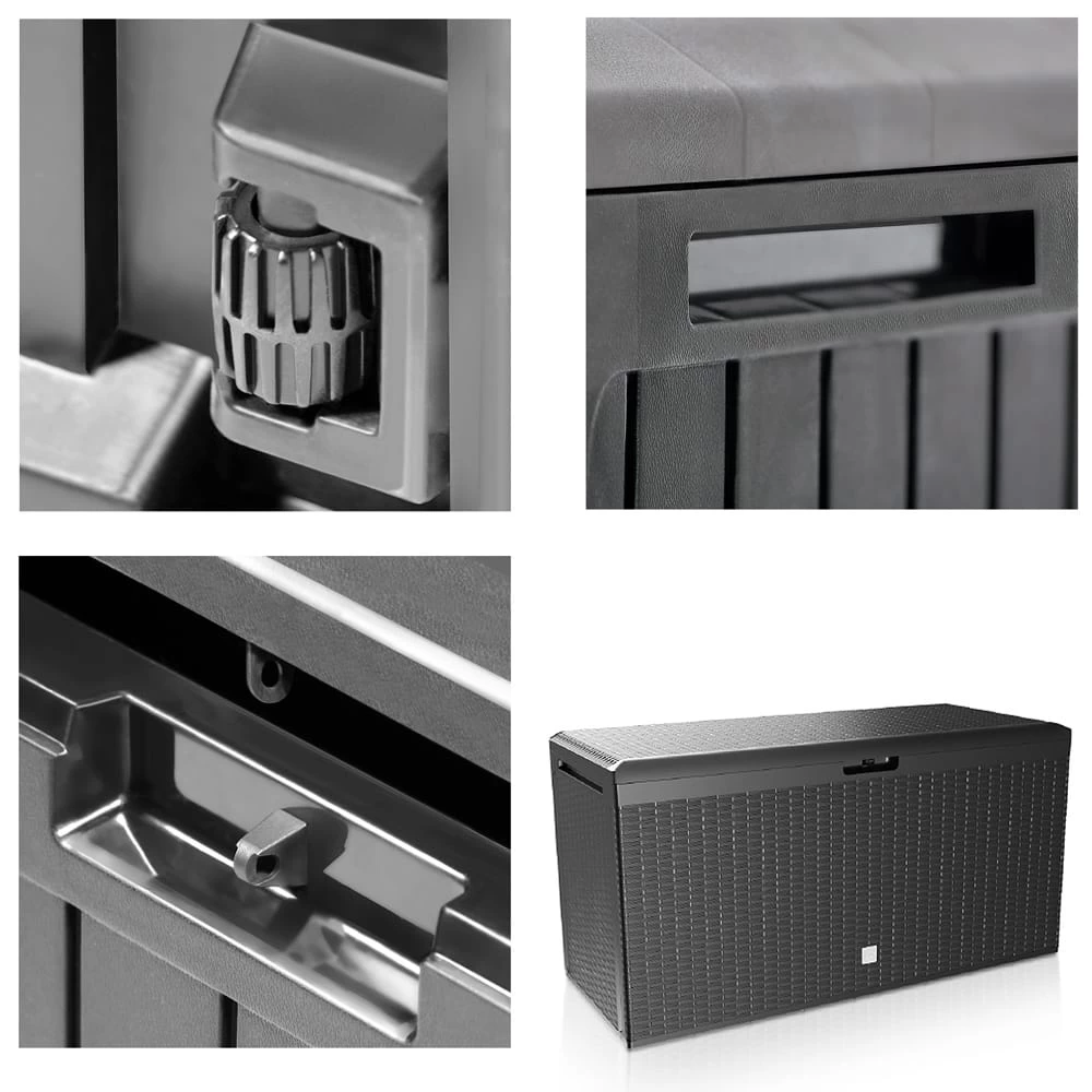 Die wetter- und UV-beständige Auflagenbox mit einem Volumen von 290 Litern bietet ausreichend Platz. Sie besitzt 6 Rollen zum einfachen Bewegen, eine Verschlussvorrichtung am Deckel und seitliche Tragegriffe.