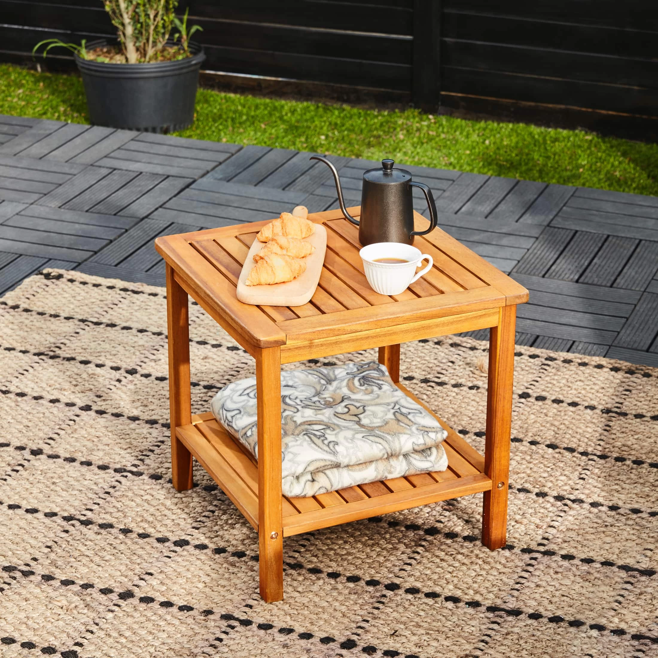 Der elegante, 2-lagige Beistelltisch aus vorgeöltem Akazienholz eignet sich überall da, wo schnelle Ablagemöglichkeiten gebraucht werden.