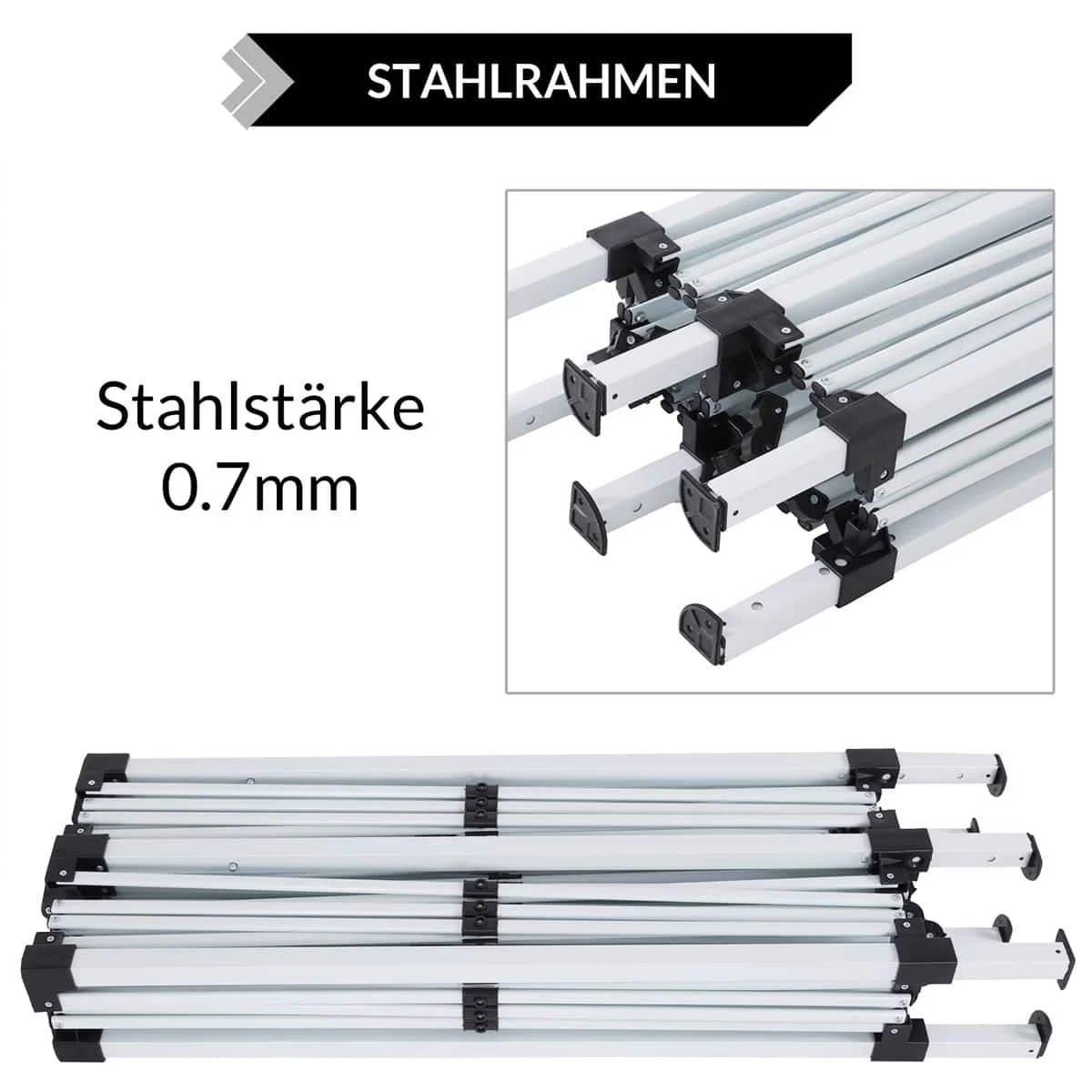 Die Stahlrohre haben einen Stärke von 0,7mm. Metallverstrebungen und verankerbare Füße geben dem Pavillon einen sehr stabilen Stand.