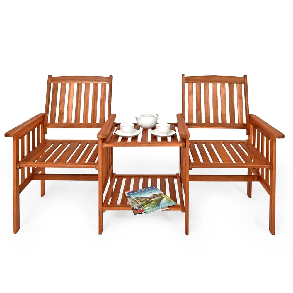 Die CASARIA® Gartenbank mit integriertem Tisch lädt zu gemütlichen Stunden im Garten oder auf dem Balkon ein. Die Sitzbank ist durch ihren edlen Look und die natürliche Maserung des massiven Holzes an jedem Standort ein echter Eyecatcher. Die hochwertige Holzbank eignet sich perfekt für drinnen und draußen. Akazienholz ist extrem robust und wetterbeständig, somit ist die Parkbank mit Tisch ideal für jeden Außenbereich. Der 2-Sitzer bietet mit zwei Ablage- Ebenen genügend Platz um deine Speisen und Getränke abzustellen. Mit den beidseitigen Armlehnen, den hohen Rückenlehnen und einer angenehmen Sitzhöhe von 42,5cm bietet die Sitzbank dir den perfekten Sitzkomfort.