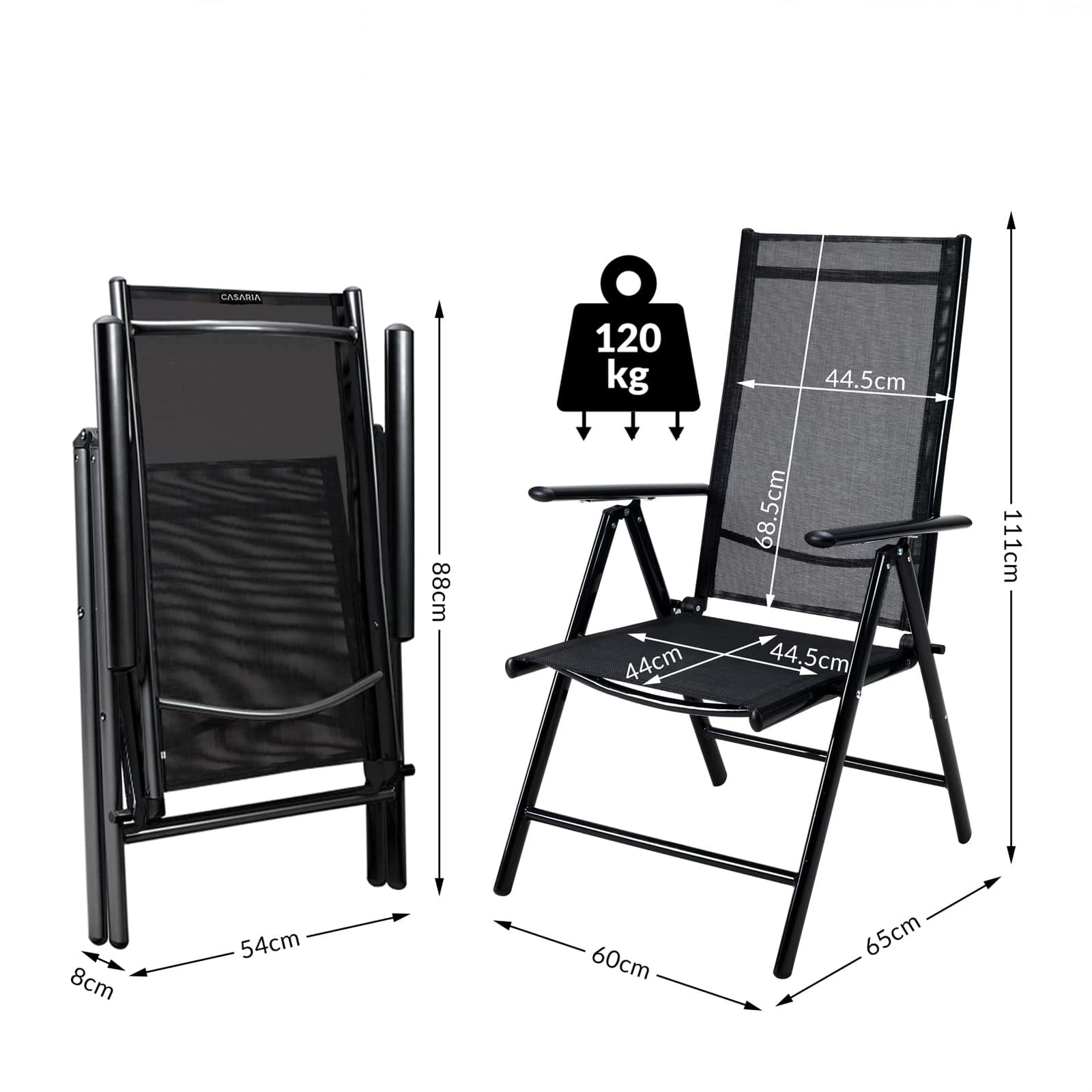 Die Bezüge der Stühle sind aus wetterfestem, strapazierfähigem, pflegeleichtem und abwaschbarem Textilen-Kunststoffgewebe.