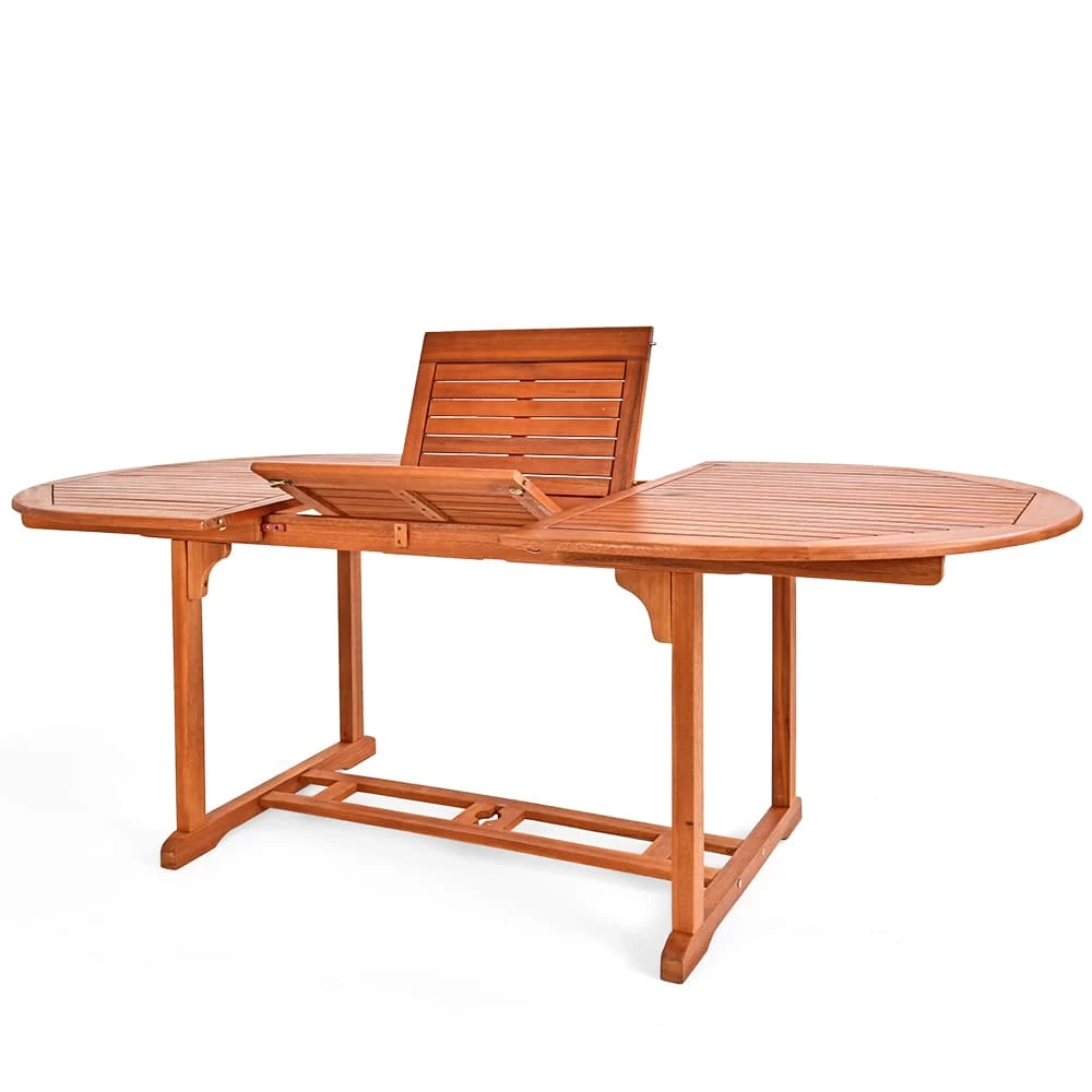 Der Tisch ist aus witterungsbeständigem Eukalyptusholz hergestellt.