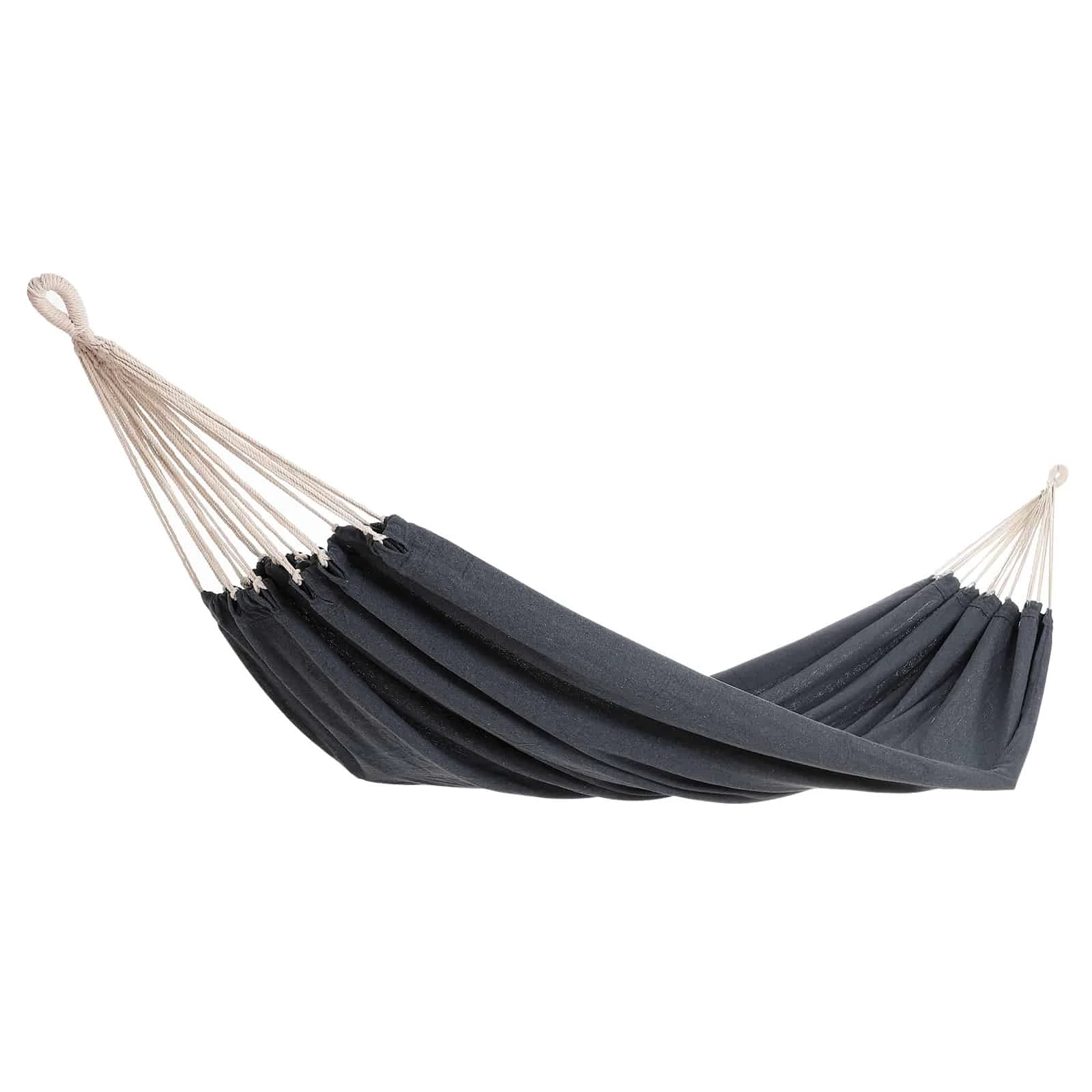Die Hängematte besteht aus atmungsaktivem 320 g/m² Baumwoll-Polyester-Gemisch, der anschmiegsame Stoff ist hautfreundlich, wetterfest und wasserabweisend. Die Seile sind durch die gedrehten Zöpfe an den Enden sehr robust.