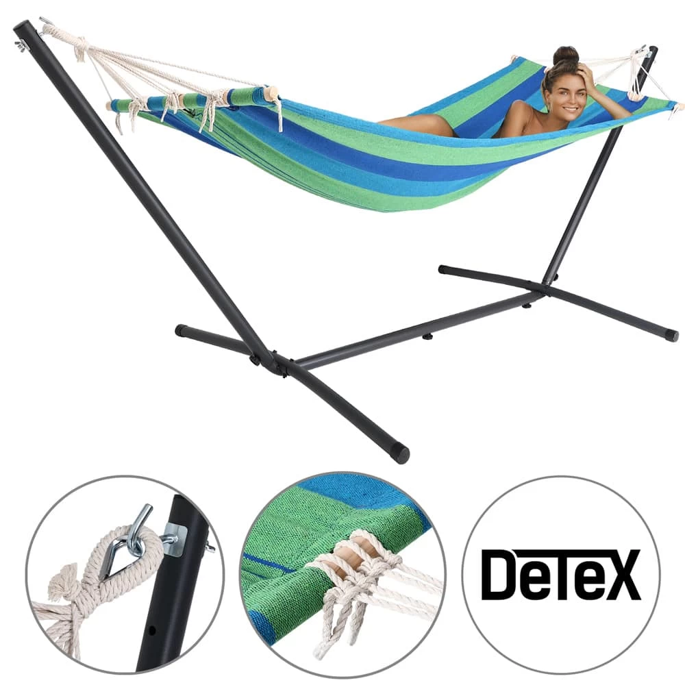 Die längenverstellbare Hängematte mit robustem Gestell verfügt über ein sehr strapazierfähiges Tuch. Die robuste Metallkonstruktion gibt einen stabilen Halt und die richtige Standfestigkeit.