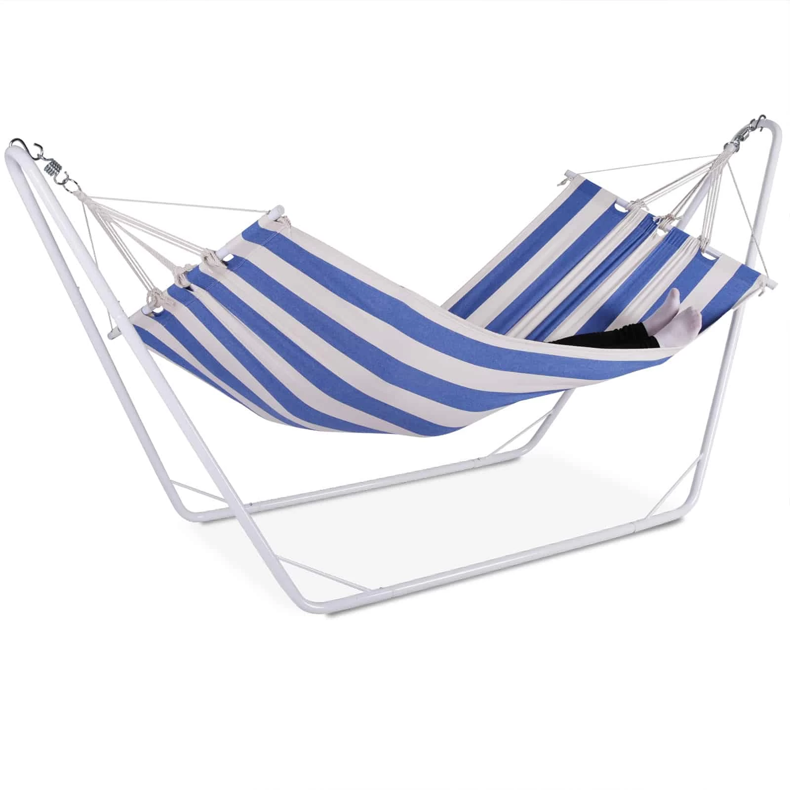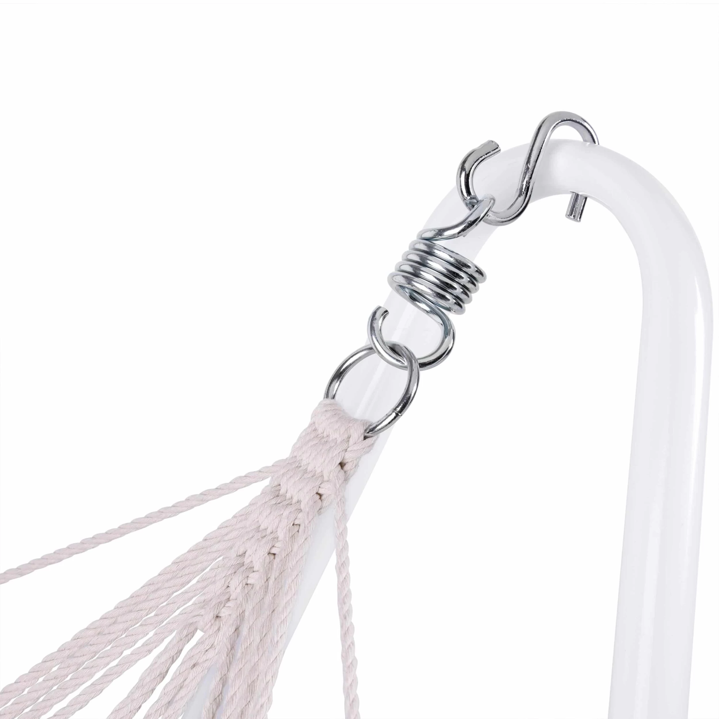 Durch die Schnellverschlüsse ist die Hängematte schnell montiert und bei Bedarf platzsparend zerlegbar. Stabile Haken und verstärkte Schlaufen, lassen Sie bequem und sicher entspannen.