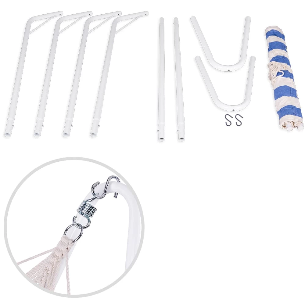 Unabhängig von Bäumen oder Dachvorsprüngen können Sie dieses Schmuckstück platzieren wo immer Sie wollen. Die Matte ist sehr strapazierfähig und bietet eine Tragkraft von 150kg. Die robuste Metallkonstruktion gibt einen stabilen Halt und die richtige Standfestigkeit.