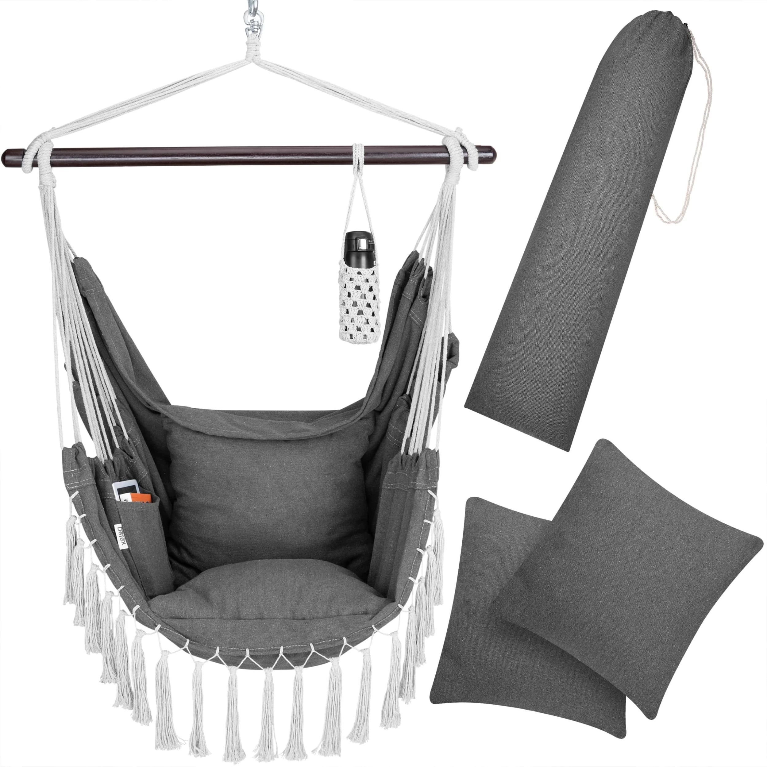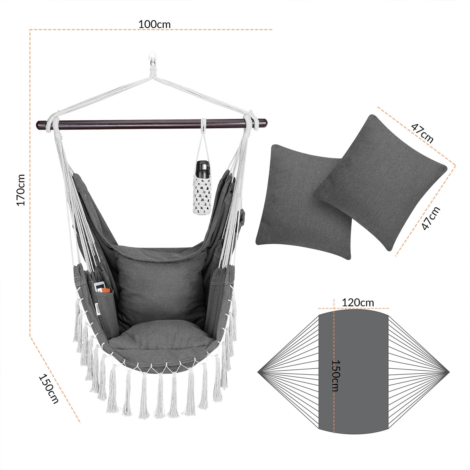 Der bequeme Hängesessel von Detex® bietet mit den 2 abnehmbaren Kissen einen sehr hohen Sitzkomfort. Dank der integrierten, großen Innentasche haben Sie Ihr Handy, Tablet oder Ihre Bücher schnell zur Hand. Der praktische Getränkehalter hält auch schwere 1-Literflaschen sicher am Platz. Der Flaschenhalter kann flexibel an der Haltestange befestigt werden und das Getränk ist so stets griffbereit.