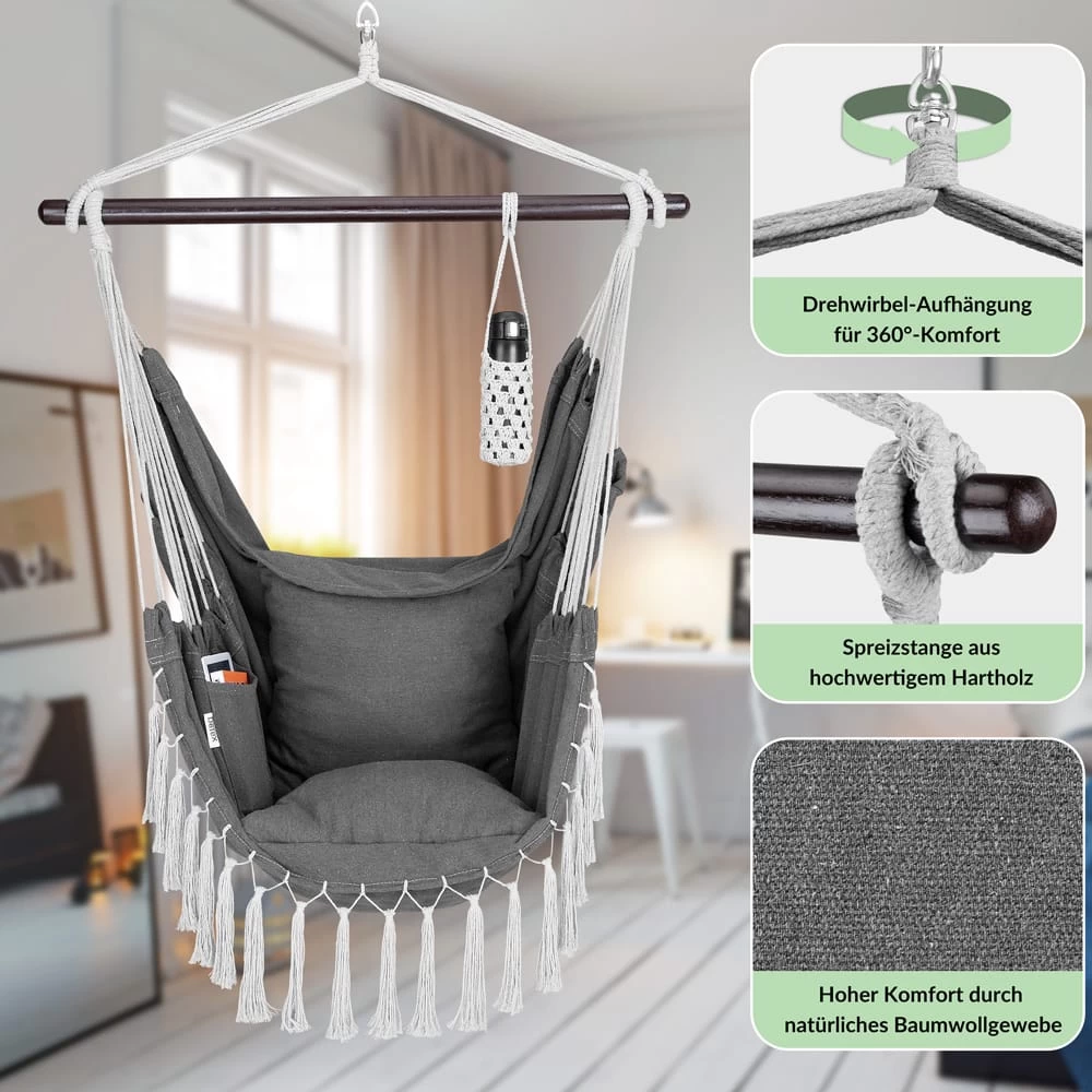 Mit der 360° Komfort-Drehwirbel-Aufhängung an einem massiven Stahl-Haken kann der Hängesessel individuell ausgerichtet und in alle Richtungen geschaukelt werden.