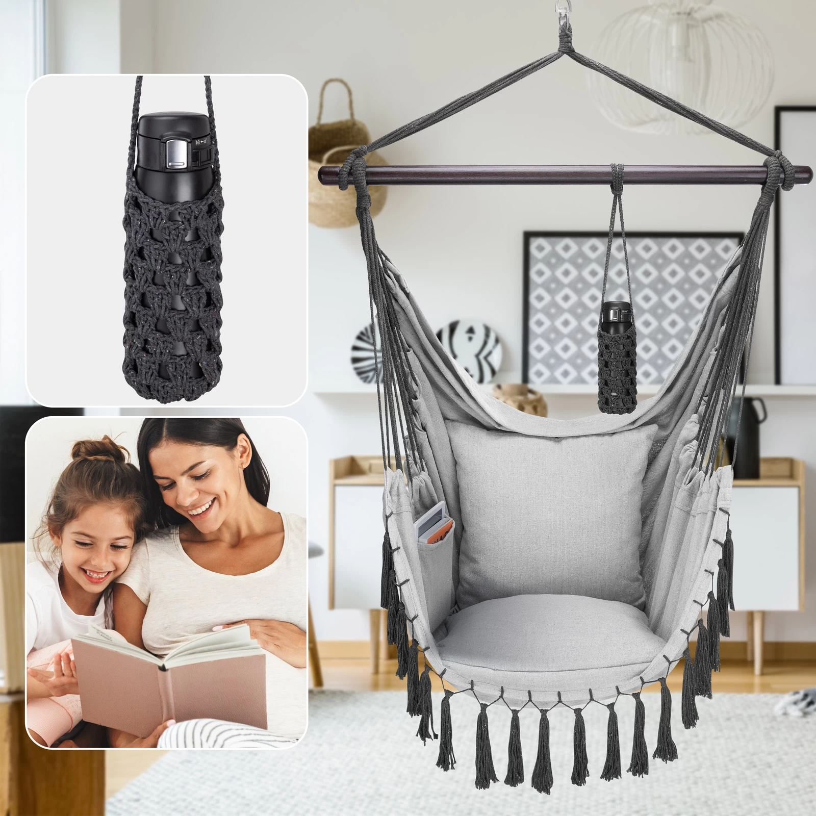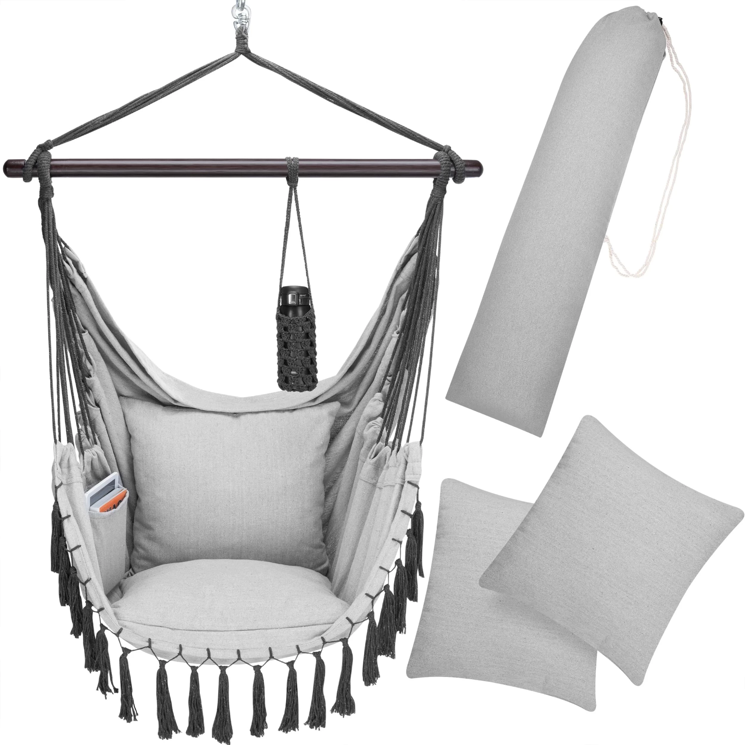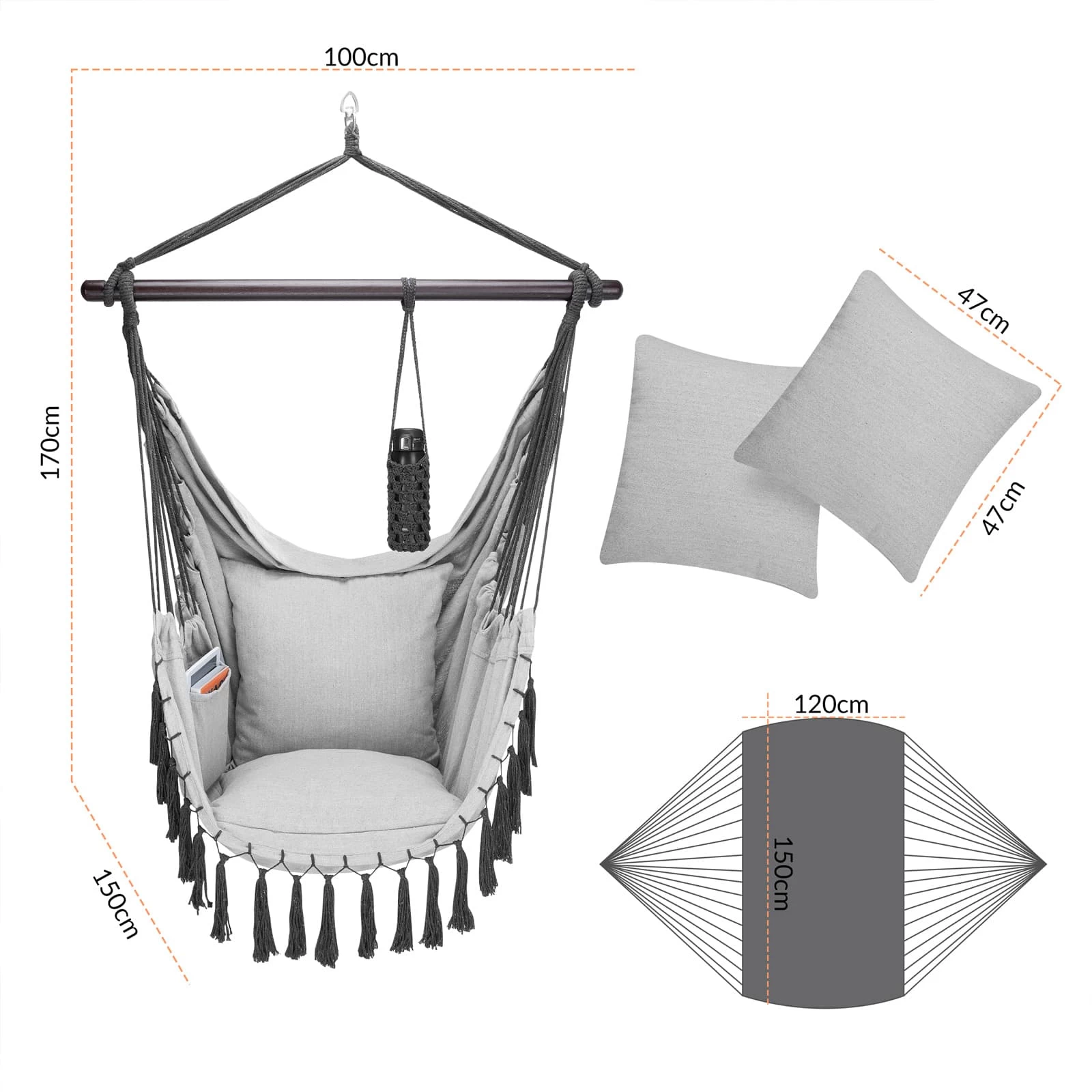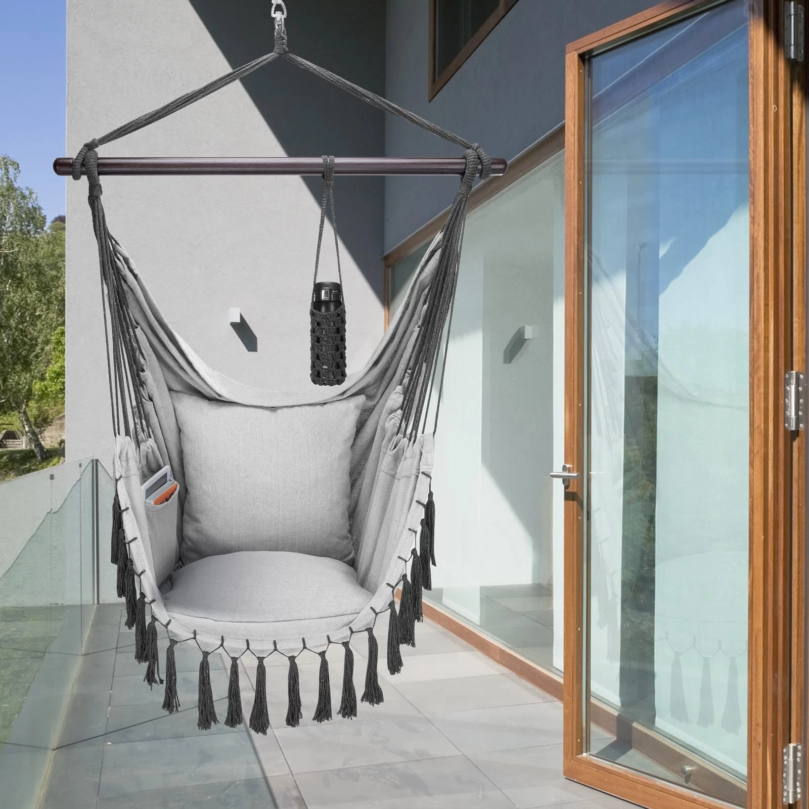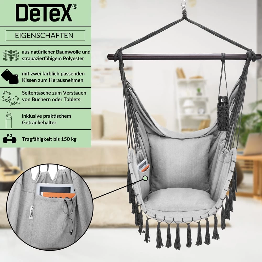 Der bequeme Hängesessel von Detex® bietet mit den 2 abnehmbaren Kissen einen sehr hohen Sitzkomfort. Dank der integrierten, großen Innentasche haben Sie Ihr Handy, Tablet oder Ihre Bücher schnell zur Hand. Der praktische Getränkehalter hält auch schwere 1-Literflaschen sicher am Platz. Der Flaschenhalter kann flexibel an der Haltestange befestigt werden und das Getränk ist so stets griffbereit.