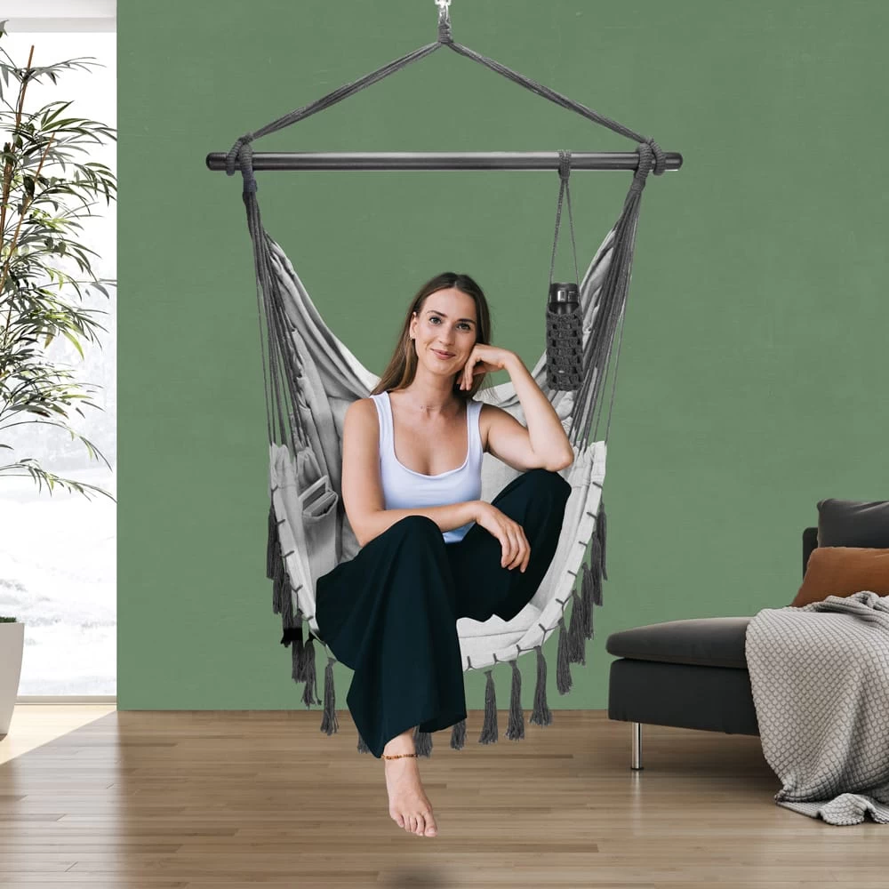 Mit der 360° Komfort-Drehwirbel-Aufhängung an einem massiven Stahl-Haken kann der Hängesessel individuell ausgerichtet und in alle Richtungen geschaukelt werden.