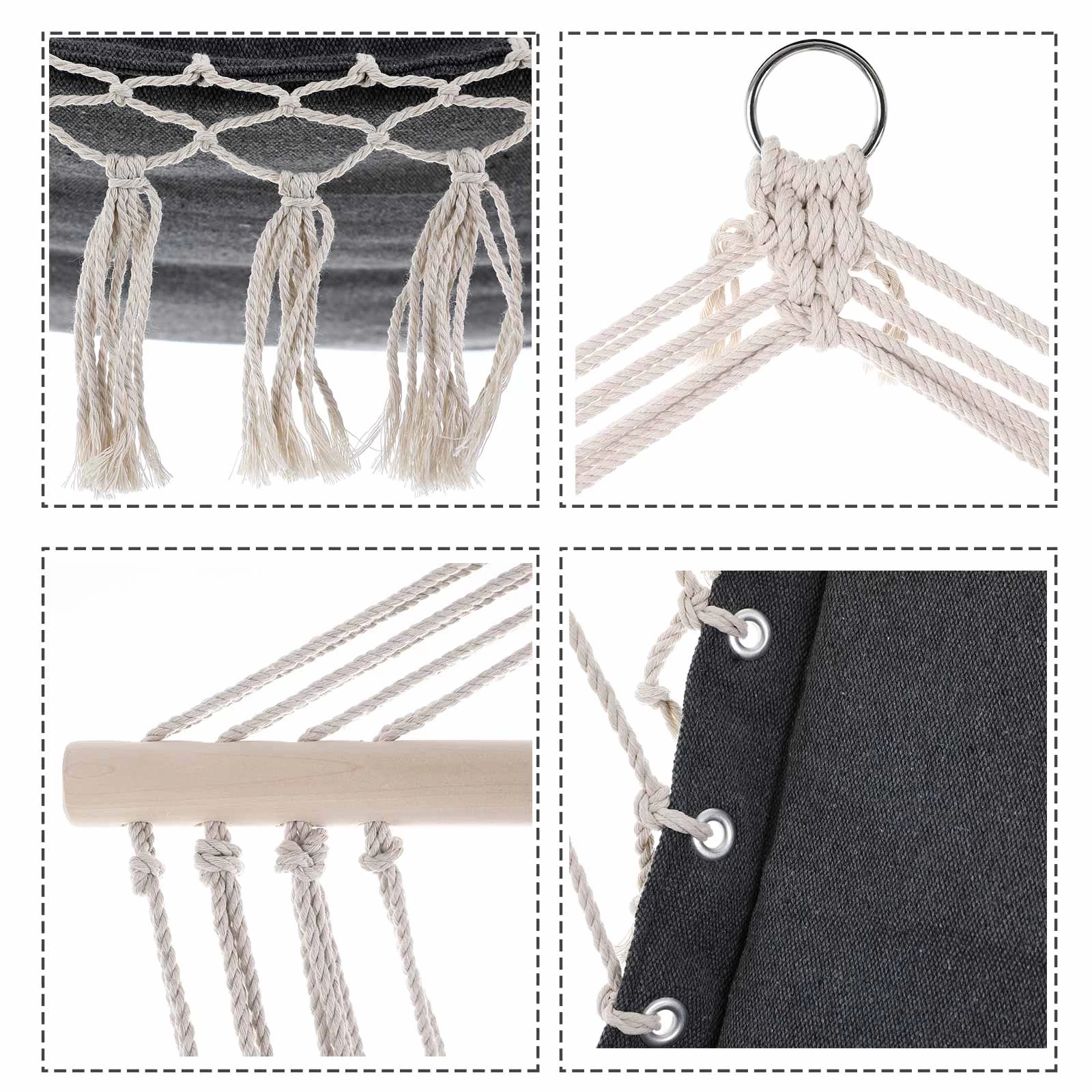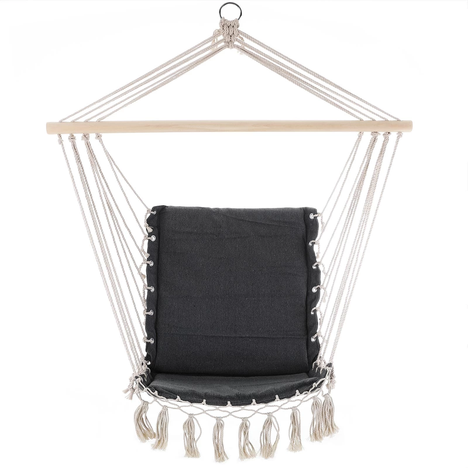 Das Sitzpolster sogt für mehr Bequemlichkeit, es besteht aus atmungsaktivem 320 g/m² Baumwoll-Polyester-Gemisch, der anschmiegsame Stoff passt sich der Form Ihres Körpers an, ist hautfreundlich, wetterfest und wasserabweisend. Der Hängesessel wird durch reißfeste Schnüre mit der stabilen Holzquerstange und dem robusten Stahlring verbunden.