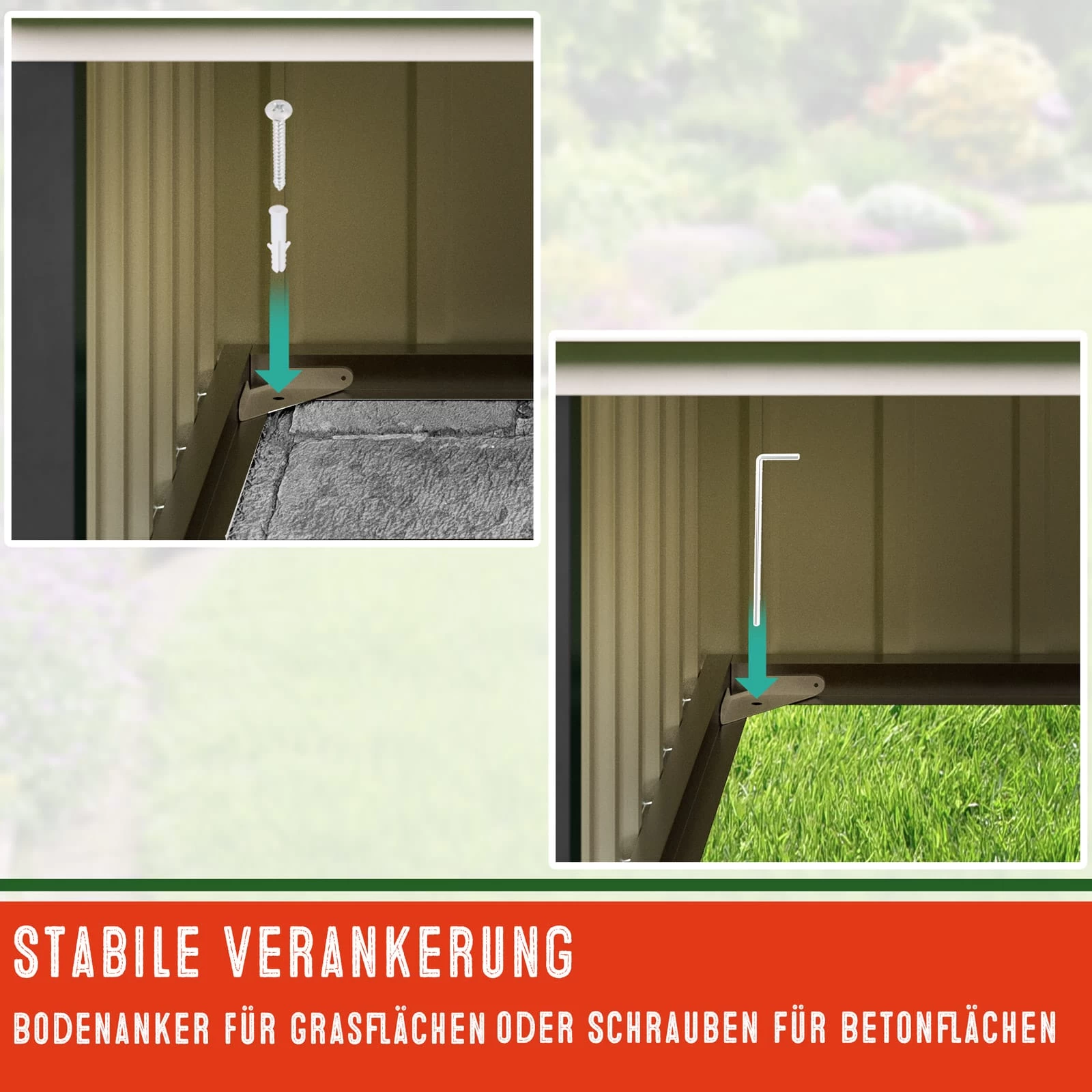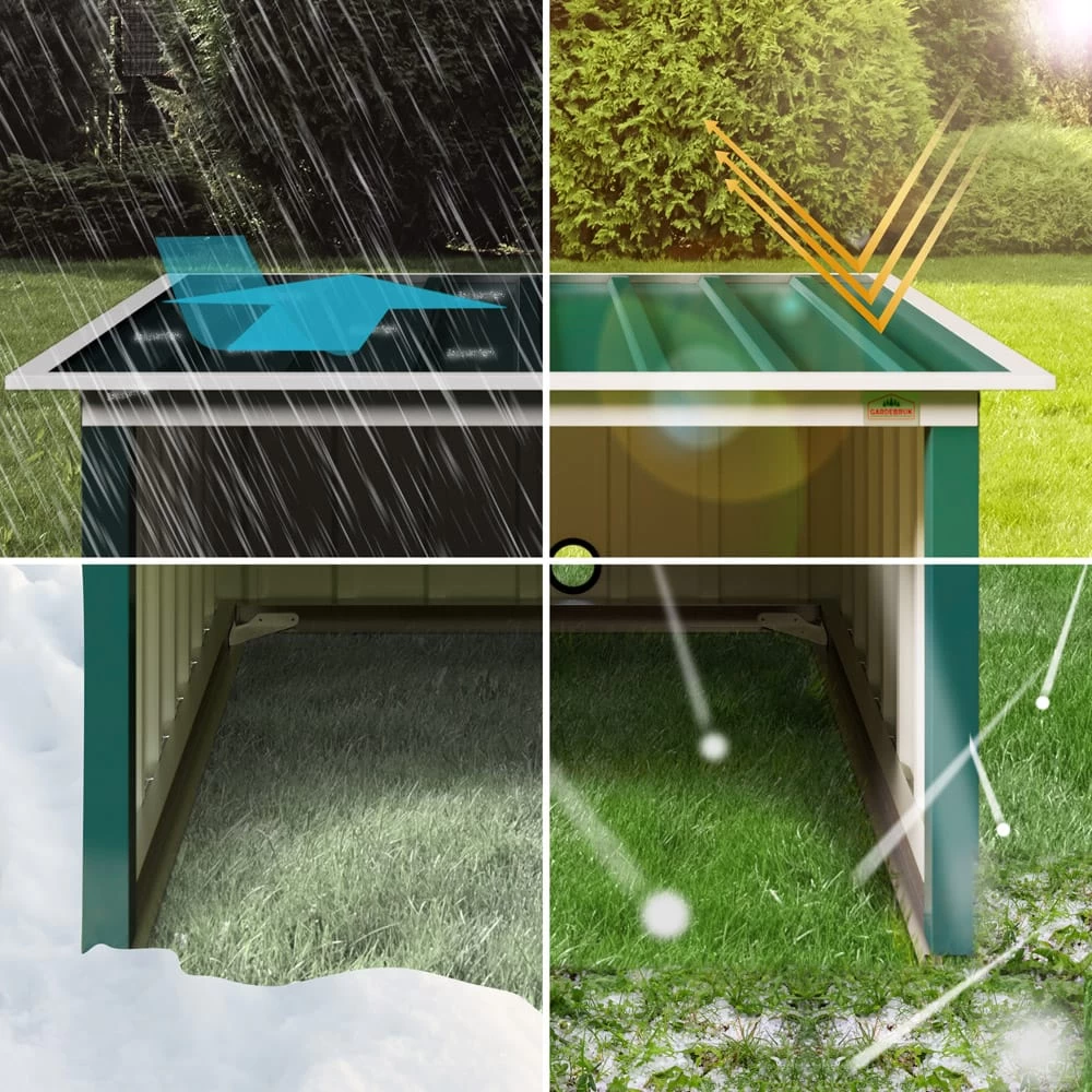 Die Trapez-Form der Metallplatten sorgt für eine optimale Wandstabilität. Zusätzliche Bodenleisten, Metallwinkel und 4 massive Erdnägel erhöhen die Stabilität und schützen die Garage vor Sturmwind. Durch die hochwertige Verzinkung ist der Unterstand äußerst resistent gegen Kälte und Rost.