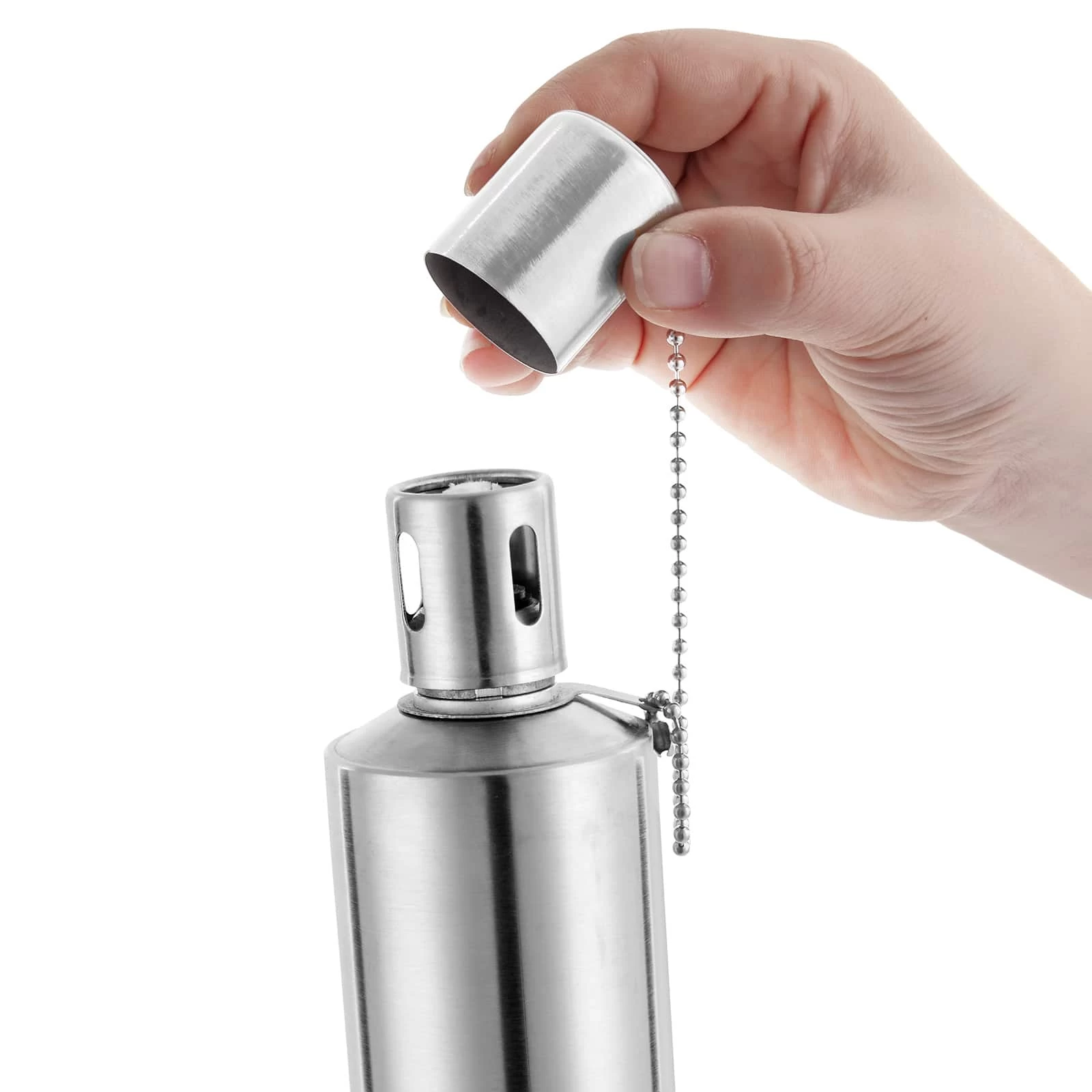 Die Fackel ist mit einem kräftigen Docht mit Metallclip ausgestattet, einfach zu befüllen und schnell aufgestellt. Der praktische Deckel verhindert, dass der Docht bei Regen feucht wird.