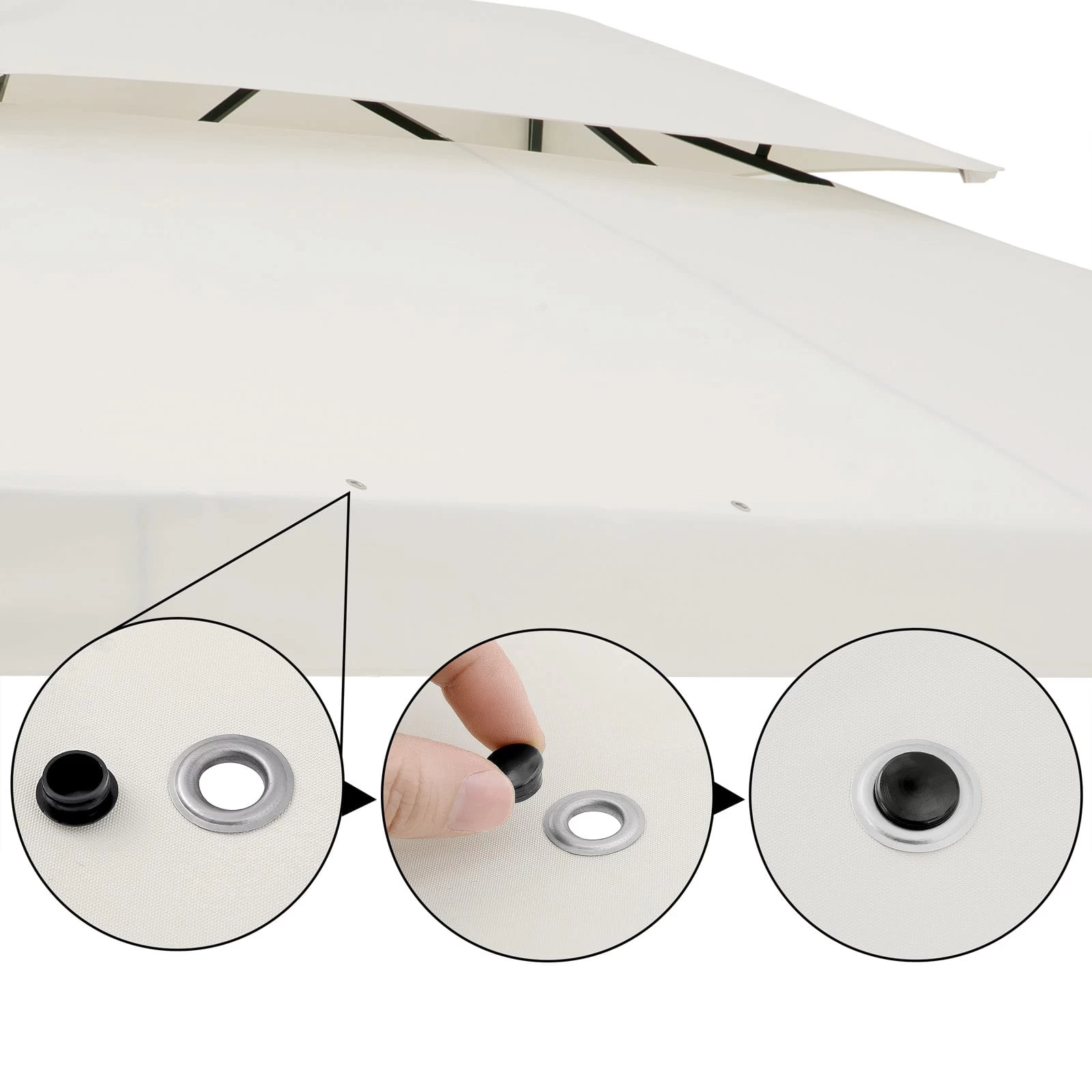 Die UV 50+ Dachbespannung besteht aus reißfestem Polyester und hat zusätzlich an der Innenseite eine wasserabweisende PU Beschichtung. Zudem kann das Dach mit Klettverschlüssen schnell und einfach am Gestänge befestigt werden, wodurch es stramm gespannt ist. Um die Bildung von Wassersäcken bei Regen zu vermeiden, sind Metallösen im Dach integriert. Diese können Sie nach Ihren Wünschen auch mit den mitgelieferten Kunststoffstopfen schließen.