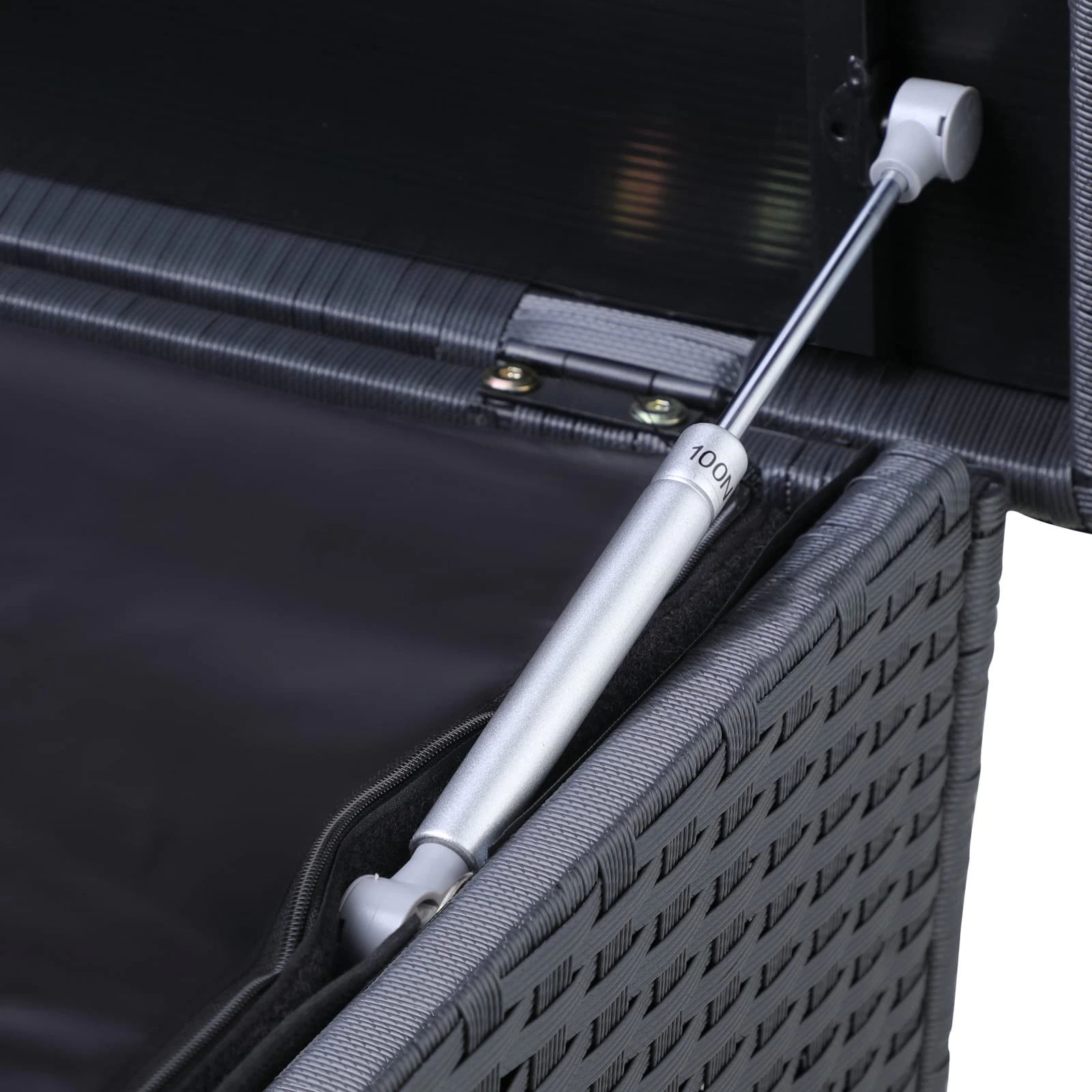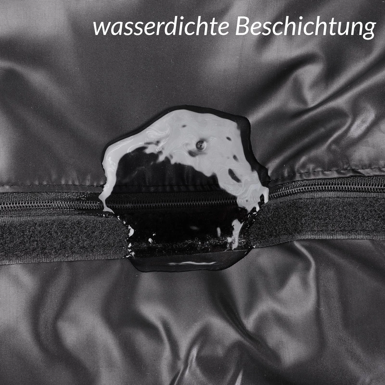 Die sich darunter befindende Innenverkleidung aus Polyester ist wasserdicht und wird mit Klett im Inneren der Gartentruhe befestigt. Zusätzlich lässt die umlaufende Tropfkante Regenwasser abtropfen, wodurch ein Eindringen von Wasser verhindert wird.