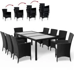 Das 17-tlg. Polyrattan-Set besteht aus 1 Tisch, 8 Stühlen mit 8 abnehmbaren Kissen (doppelt gekettelt) und ist für bis zu 8 Personen geeignet..