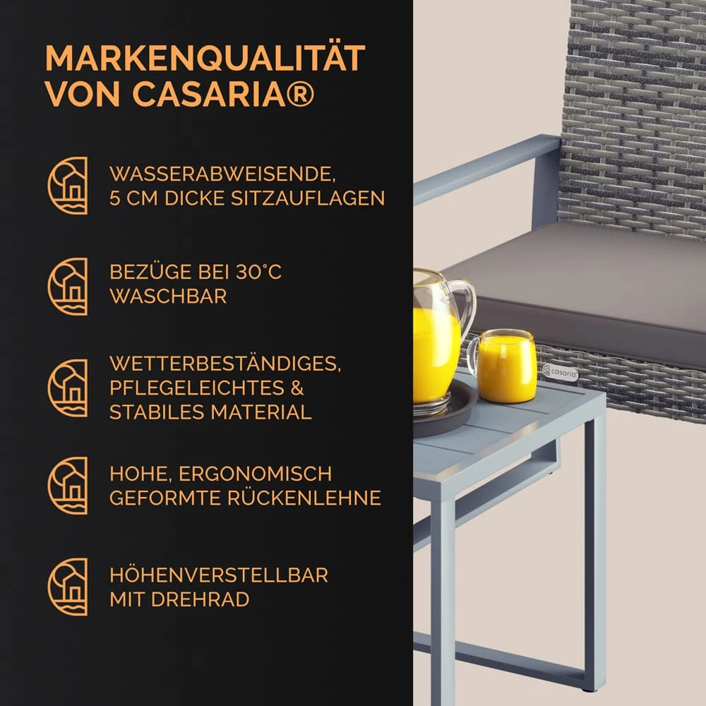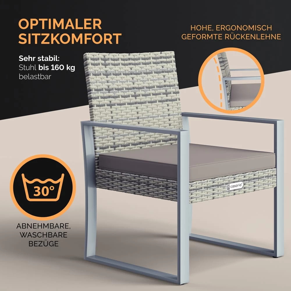 Mit diesem 3-teiligen Set von Casaria® hast du alles, was du für gemütliche Sommerstunden im Garten oder auf dem Balkon brauchst: zwei weich gepolsterte Stühle für dich und Besuch und einen kompakten Tisch für Limo, Knabbereien oder einen Cocktail bei Sonnenuntergang.
