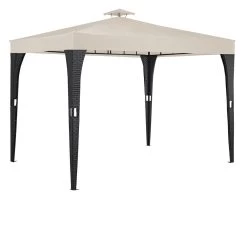 Der Polyrattan Pavillon besticht durch seine schlichte Eleganz und die fein ausgearbeiteten Details. Das Polyrattan ist schmutzabweisend, UV-lichtbeständig und besonders pflegeleicht. An heißen Sommertagen sorgt die Dachhaube für eine angenehme Belüftung.