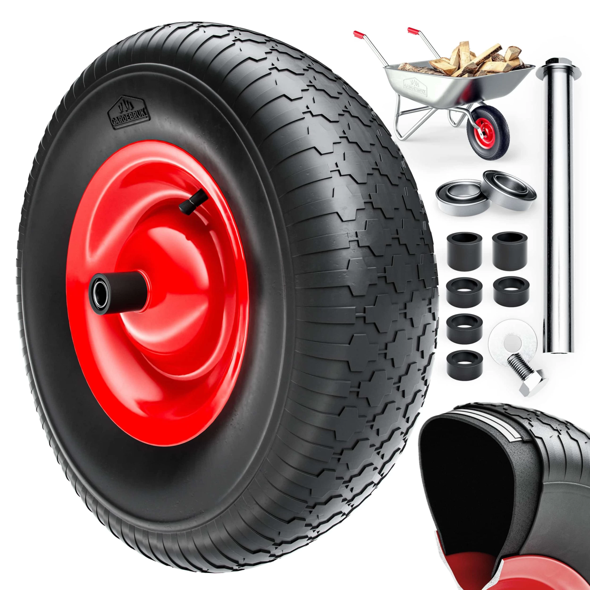 Inkl. Achse für den schnellen Austausch und Autoventil passt es auf die meisten handelsüblichen Schubkarren und überzeugt mit einer max. Tragkraft von 200 kg und einer Extrabreite von 95mm sowie 2 robusten Gewebeeinlagen (4 Ply Rating).