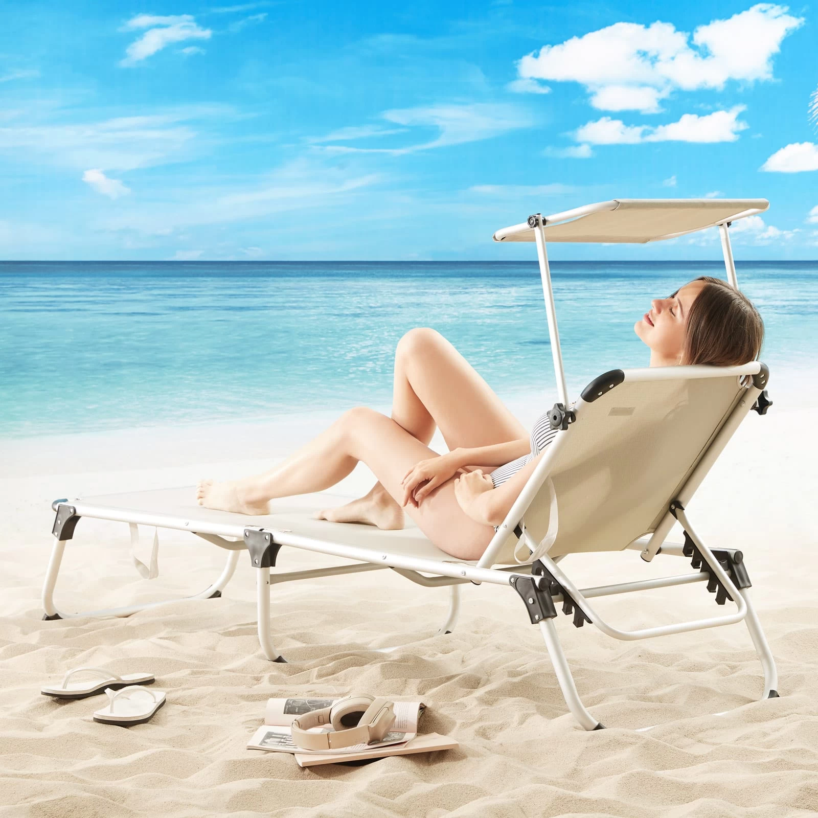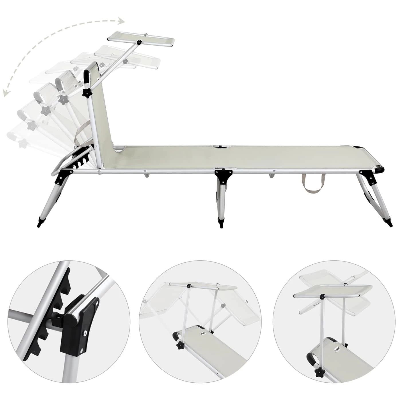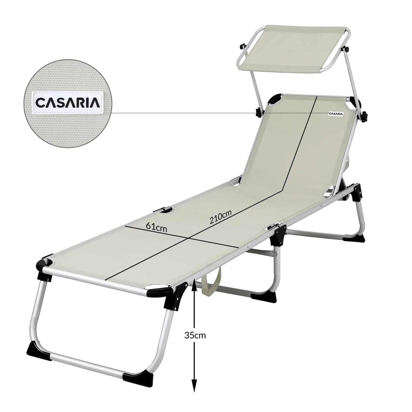 Das Sonnendach ist stufenlos verstellbar. Die robusten Metallgelenke sowie extra verstärkte Arretiergelenke sorgen für einen stabilen Stand. Die Bespannung der Liege ist durch den 2×2 Textilbezug wetterfest und UV-beständig.