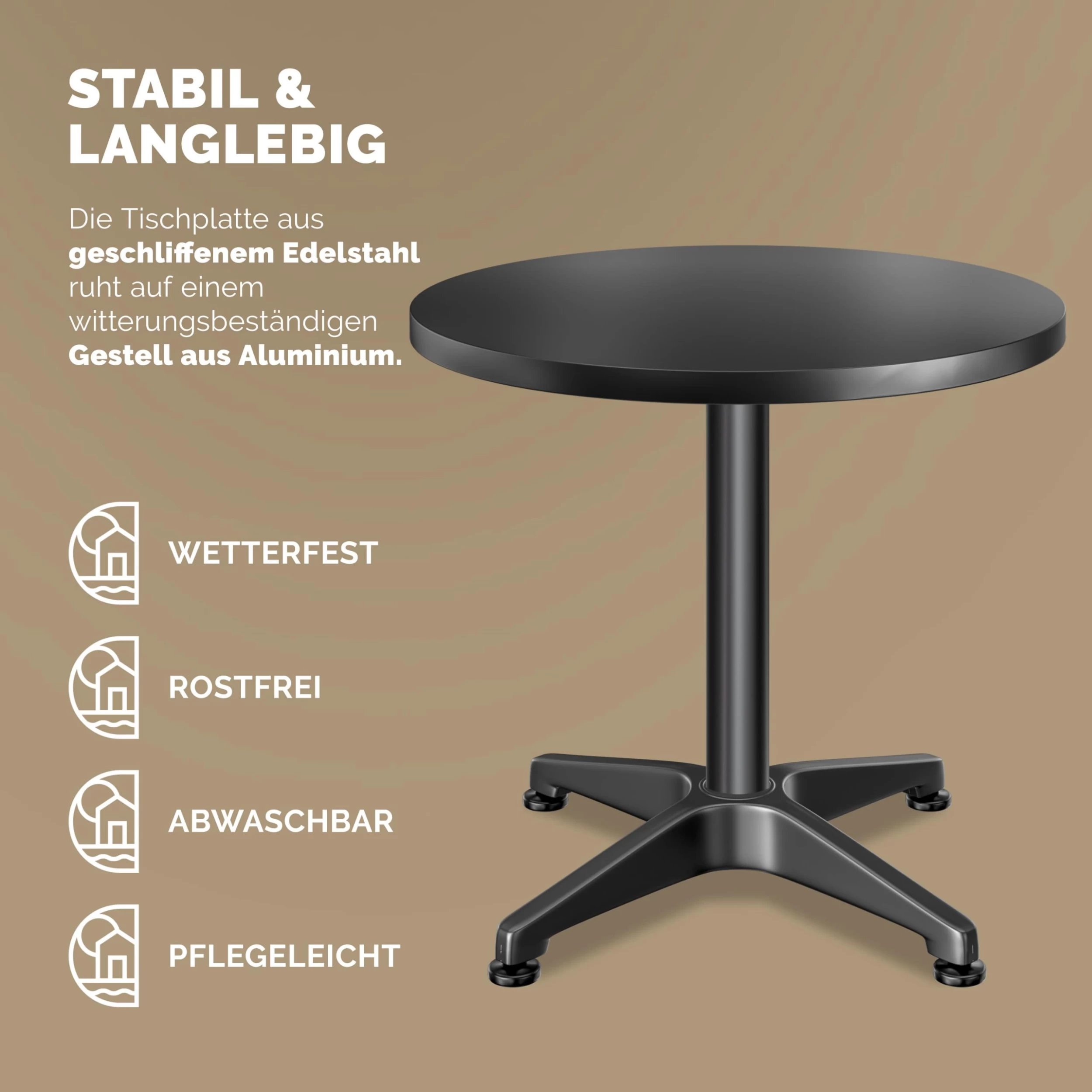 Der Bistrotisch ist dank rostfreiem Aluminium für den Outdoorbereich geeignet. Auch in Innenräumen ist er vielfältig einsetzbar und macht die Bewirtung in einem Festzelt, in der Küche oder im Wintergarten zum Vergnügen.