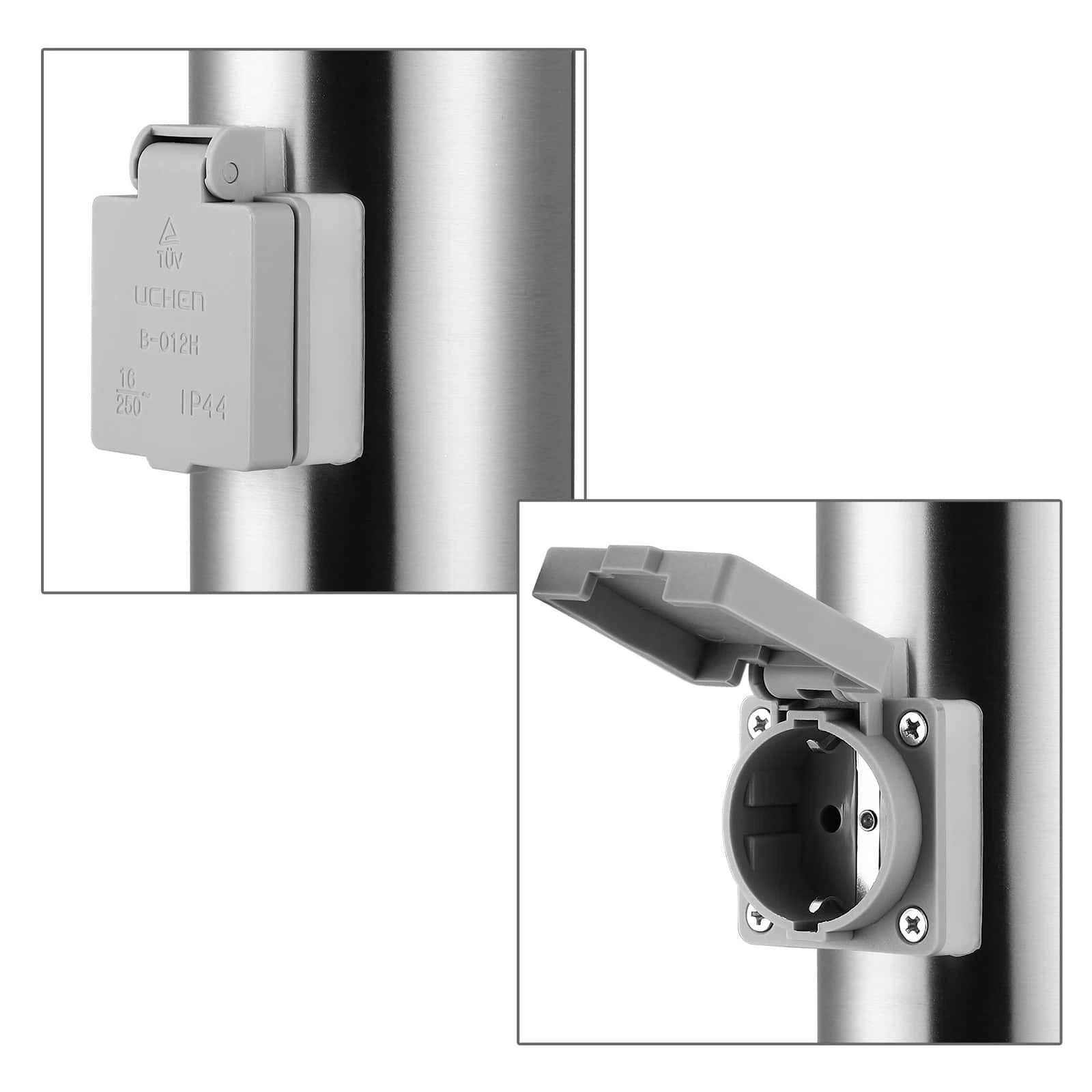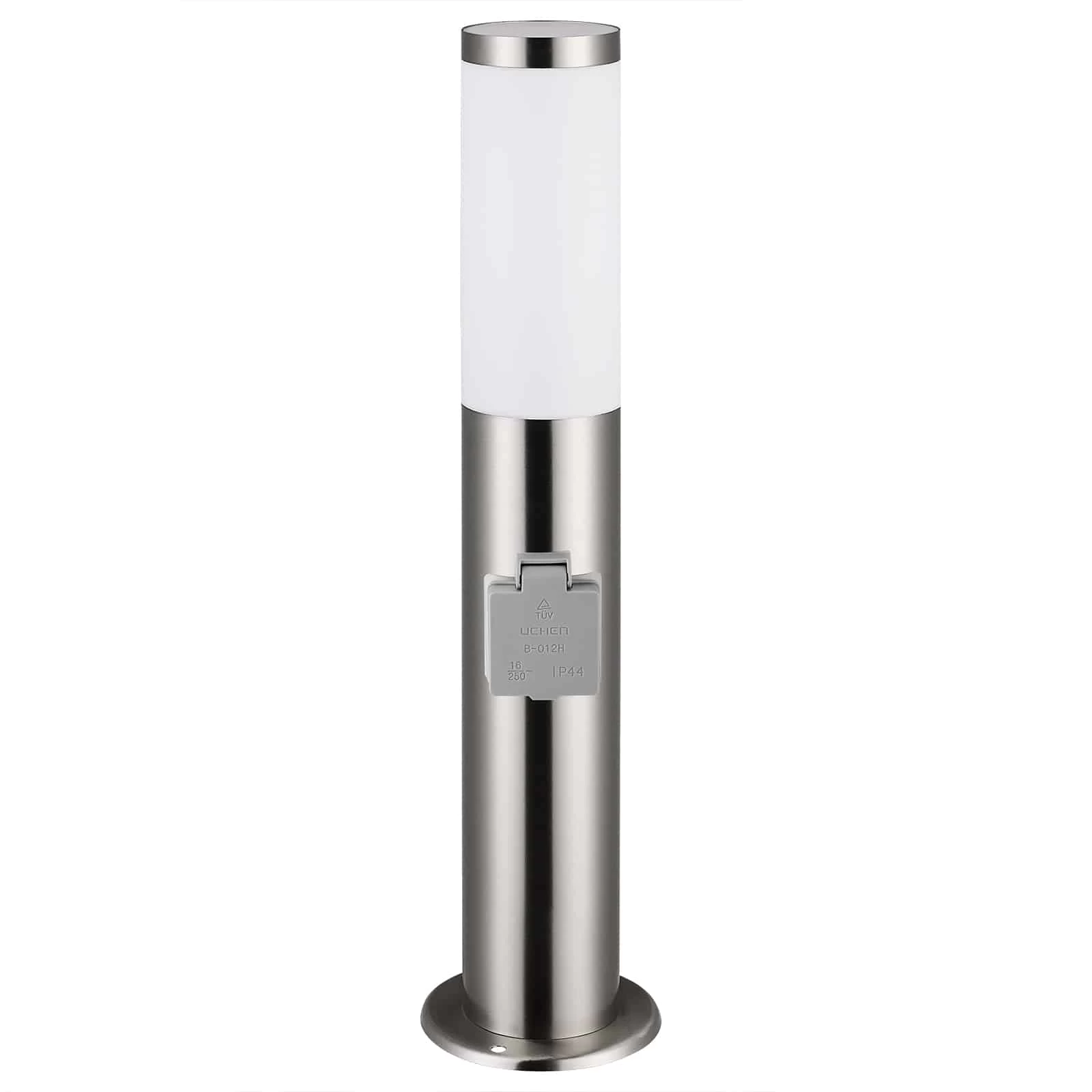 Die Außenleuchten aus Edelstahl haben eine zusätzliche Steckdose, sind spritzwassergeschützt (IP44) und wetterbeständig und so perfekt für den In-/und Outdoorbetrieb geeignet.