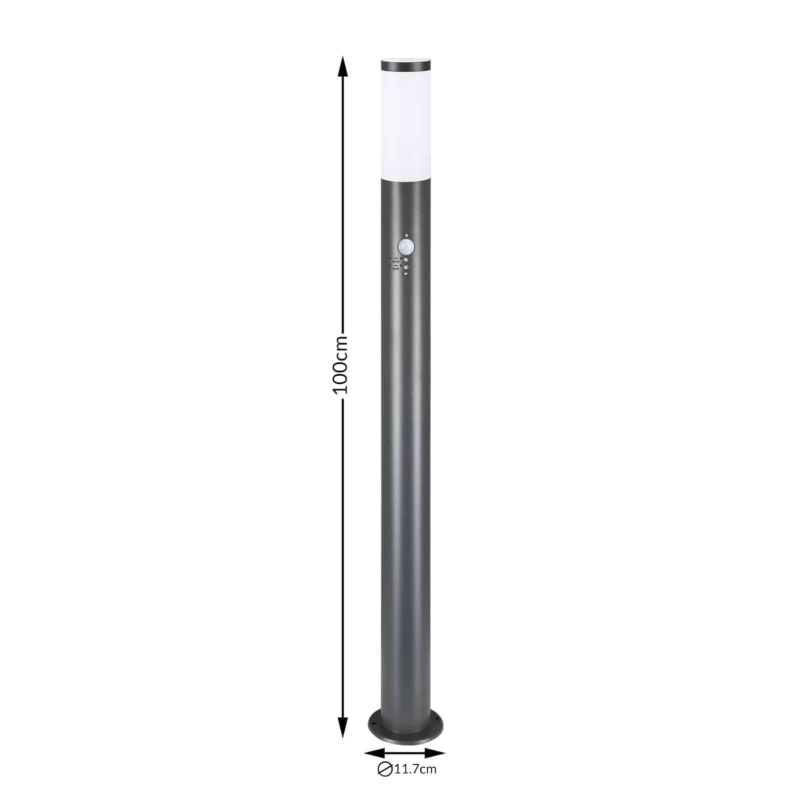 Die Außenleuchte aus Edelstahl ist mit einem Bewegungssensor ausgestattet, der in der Helligkeitsempfindlichkeit und Leuchtdauer stufenlos einstellbar ist.